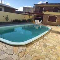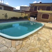 É um sobrado de 3 dormitórios (2 quartos e 1 suíte), 1 sala de estar, 1 sala de jantar, lareira, churrasqueira, garagem com espaço para 2 carros, mesa de parede dobrável para churrasco, pátio grande revestido com pedra e piscina de 1,70m de profundidade (totalmente cheia).